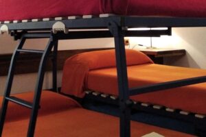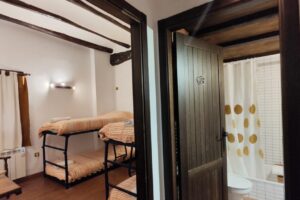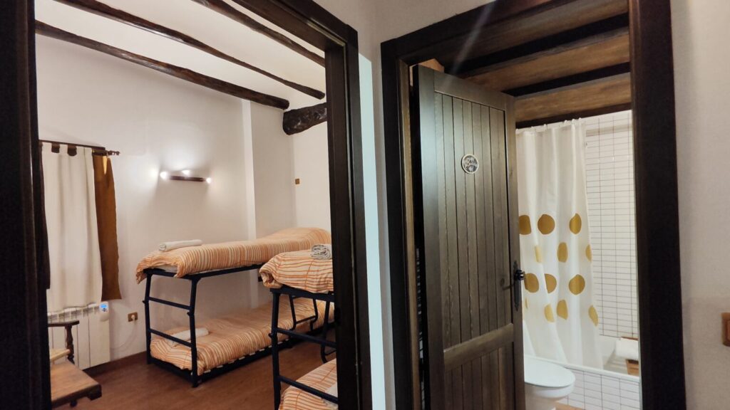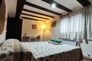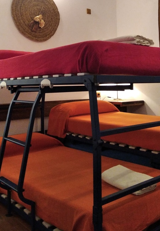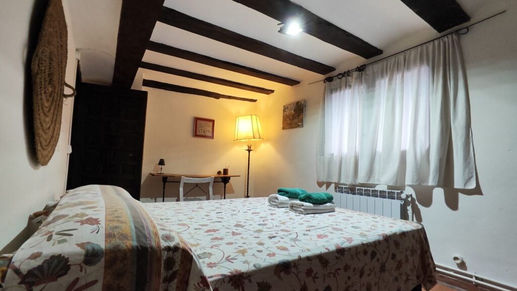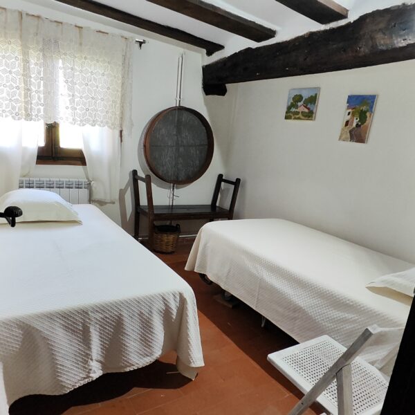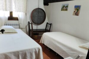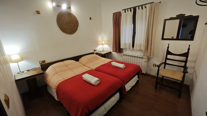 - 1 Habitación, capacidad para dos personas, con 2 camas individuales, posibilidad de desplegar las camas para formar dos literas y podrían caber 4 personas. Sábanas y edredones.